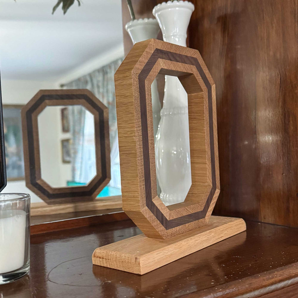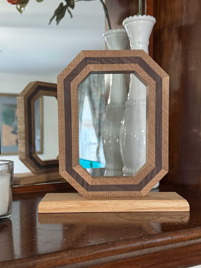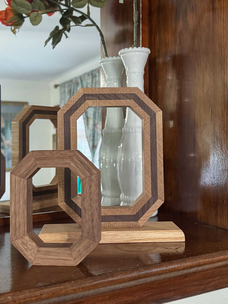 Wooden OSU Block O, two toned frame in front of  mirror on a wooden surface, Side angle