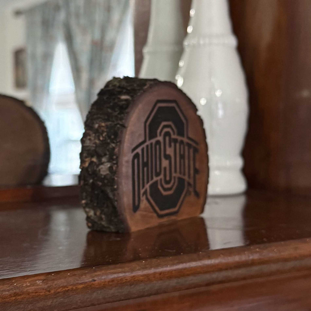 Natural wood slice with laser engraved OSU Sport Logo. Display your Buckeye pride on a bookcase, desk, or mantel.