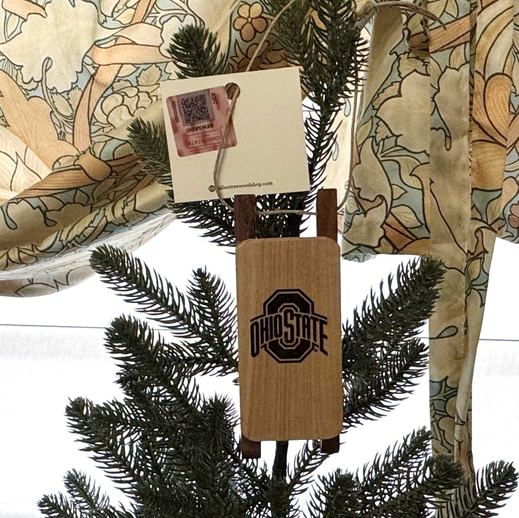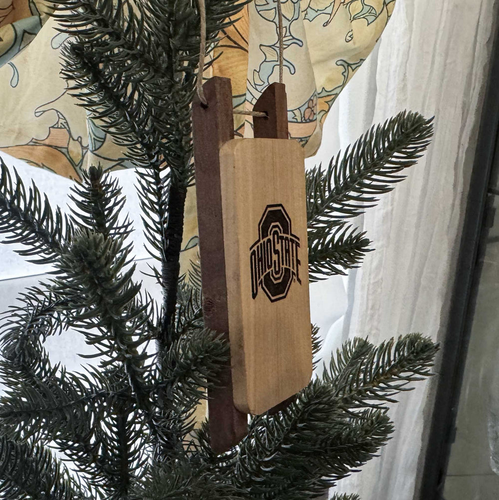 This hand made sled ornament is made from fallen wood with laser engraved Ohio State Block O Sport Logo design. Ornament is tied with twine.